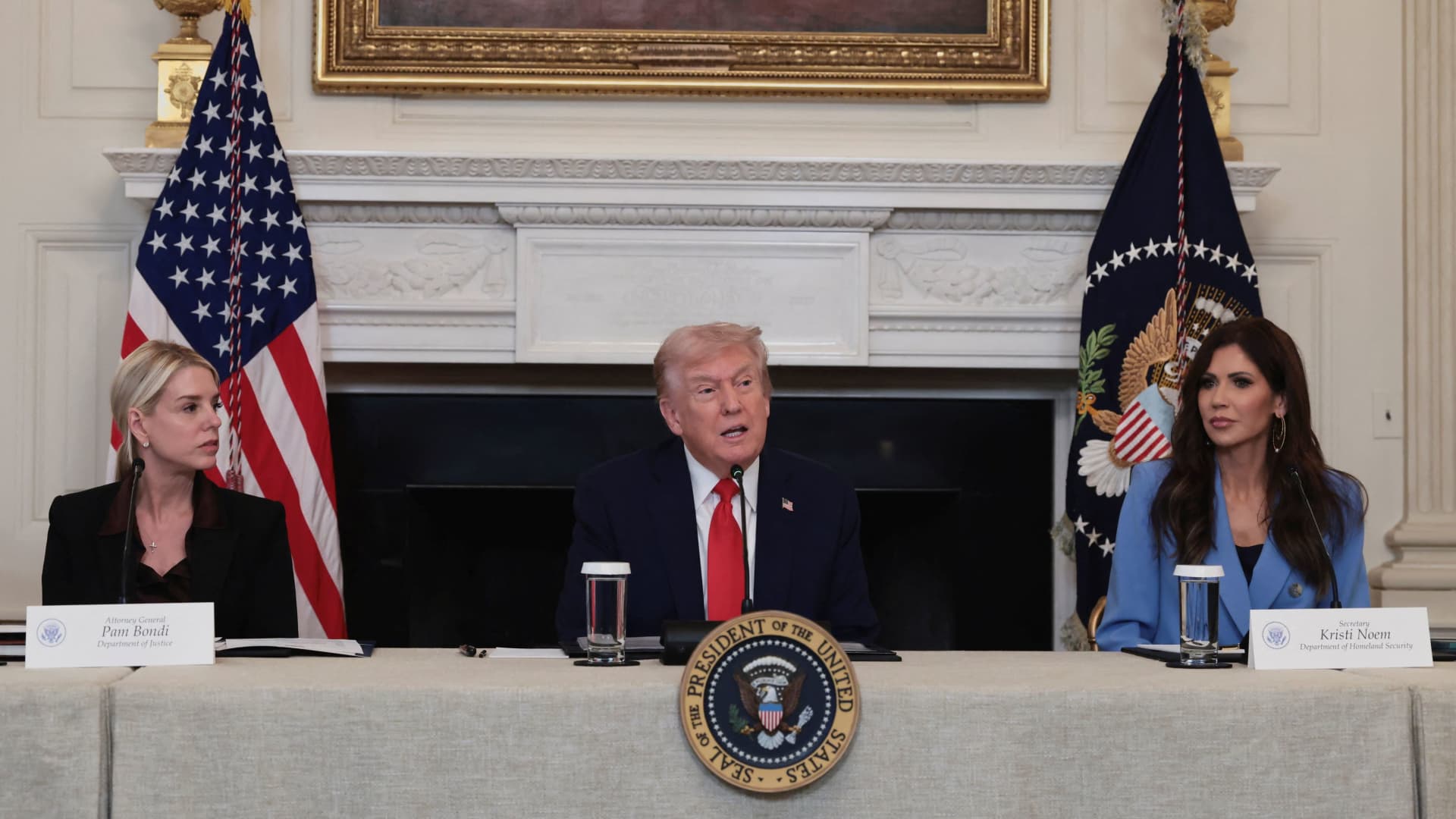 U.S. President Donald Trump, with U.S. Attorney General Pam Bondi, and U.S. Homeland Security Secretary Kristi Noem, participates in a roundtable on “Antifa,” an anti-fascist movement he designated a domestic “terrorist organization” via executive order on September 22, at the White House in Washington, D.C., Oct. 8, 2025.